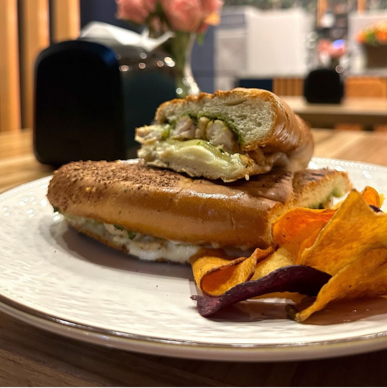 Pan tostado, pesto hecho en casa, mayo, pollo a la plancha y queso provolone servido con chips o ensalada.